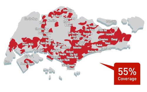 SingTel 19 августа 2014 года объявил, что аутдор покрытие сети LTE-A оператора представлено на более, чем 55% территории острова Сингапур. В зоне покрытия - Orchard, Central Business District, Shenton Way, Tampines, Jurong, Woodlands.