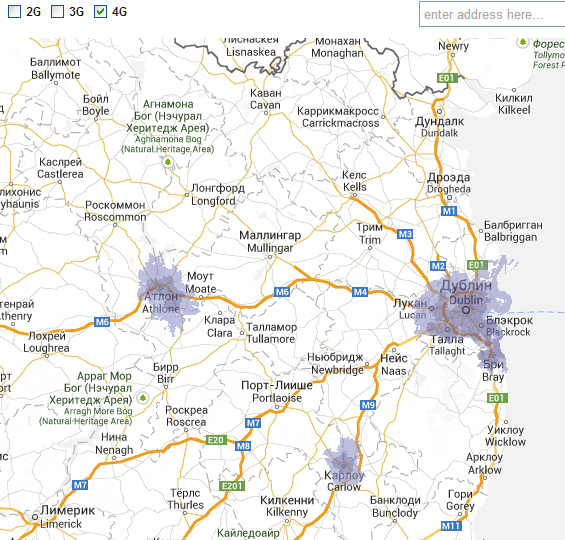 На 2013.10.14 покрытие LTE компании Eircom достаточно скромное