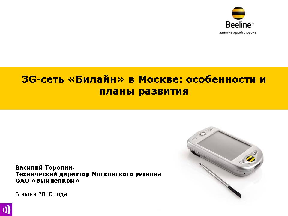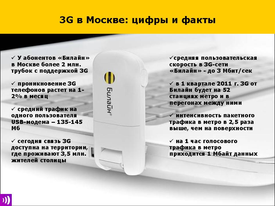 Поддерживаемая пиковая скорость - не выше 3.6 Мбит/с. 03.06.2010 Билайн представил журналистам следующую презентацию