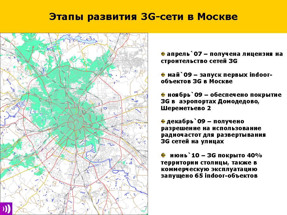 12.11.2009 Появились очаги 3G в Шереметьево 2 и Домодедово. >> 14.10.2009 14 октября компания сообщила о намерении запустить базовую станцию 3G на территории СК "Олимпийский". >>