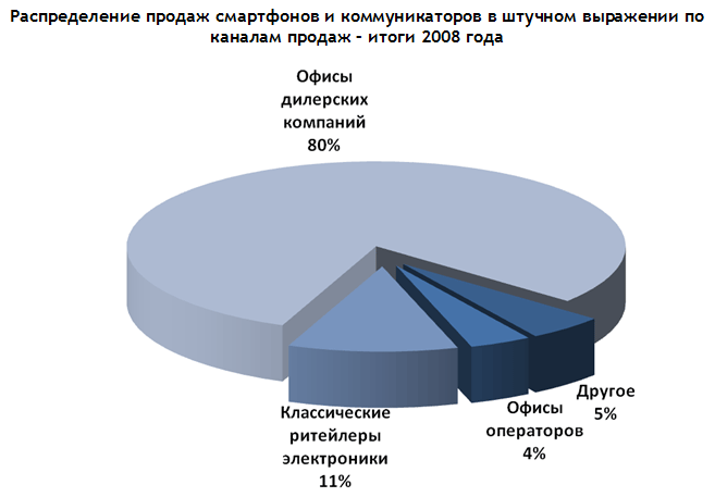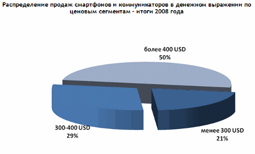 Рынок смартфоновОбзор рынка смартфонов и коммуникаторов РФ - Итоги 2008 года19.01.2009, MForum.ru MForum Analytics продолжает публикацию отчетов по состоянию рынка смартфонов и коммуникаторов* в РФ. MForum Analytics продолжает публикацию отчетов по состоянию рынка смартфонов и коммуникаторов* в РФ. * - MForum Analytics не включает рынок КПК в объем рынка смартфонов и коммуникаторов, основные тенденции на рынке КПК – снижение объемов продаж и замещение КПК смартфонами. По данным MForum Analytics, объем продаж смартфонов и коммуникаторов по итогам 2008 года в штучном выражении составил 3,43 млн. штук, в денежном выражении – 1406 MUSD. Прирост объемов продаж по итогам 2008 года в штучном выражении относительно аналогичного периода прошлого года составил 28%, в денежном выражении – 31%. При этом по итогам последнего квартала 2008 года зафиксировано снижение квартальных объемов продаж смартфонов и коммуникаторов в штучном и денежном выражении на 20% и 24%, соответственно. Снижение объемов продаж вызвано кризисными тенденциями, охватившими рынок продаж сотовых телефонов - снижением доли продаж сотовых телефонов через потребительское кредитование, снижением потребительской активности абонентов. По прогнозам MForum Analytics, рынок продаж смартфонов и коммуникаторов в 2009 году продолжит расти на фоне прогнозируемой стагнации рынка продаж сотовых телефонов. В штучном выражении объем рынка в 2009 году увеличится на 15-20%, в денежном выражении – на 5-10%. Лидирующую позицию на рынке смартфонов и коммуникаторов продолжает занимать Nokia – доля производителя в объемах рынка в штучном выражении по 2008 года составила 55%. По данным MForum Analytics, в активной продаже** на российском рынке в 2008 году было представлено около 80 моделей смартфонов и коммуникаторов. Наиболее продаваемой моделью 2008 года стала Nokia N95. ** - объем продаж каждой из моделей превысил 5 тыс. штук за 2008 год. В течение первой половины 2009 года Nokia будет гарантировано сохранять лидирующую позицию на рынке смартфонов за счет чрезмерной «пассивности» своих основных конкурентов (Samsung, Motorola, SonyEricsson) в части расширения модельного ряда смартфонов. Безусловное лидерство Nokia на рынке смартфонов является одним из основных факторов, который позволяет производителю удерживать первую позицию на рынке сотовых телефонов РФ. По данным MForum Analytics, средняя цена проданного смартфона и коммуникатора по итогам 2008 года составила 410 USD. Относительно 2007 года средняя цена увеличилась на 2%. Центральный и Приволжский Федеральные округа обеспечили более половины объема продаж смартфонов и коммуникаторов по итогам 2008 года. По данным MForum Analytics, ценовой сегмент свыше 400 USD по итогам 2008 года составил 50% в объемах продаж смартфонов и коммуникаторов в денежном выражении. © аналитик Дмитрий Деев, Более подробную информацию о рынке смартфонов и коммуникаторов можно получить в рамках аналитических отчетов MForum Analytics: