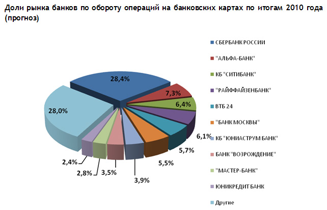 Доли рынка банков по обороту торговых операций на банковских картах по итогам 2010 года (прогноз)
