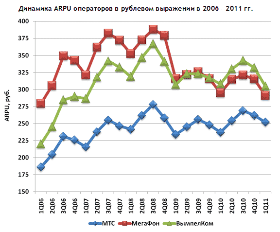 Итоги 1Q11Показатель ARPU на рынке сотовой связи РФ вырос менее чем на 2%23.06.2011, MForum.ru По итогам первого квартала 2011 года рост показателя ARPU на российском рынке сотовой связи к аналогичному периоду прошлого года составил около 1,8%. Негативная тенденция по снижению ARPU, наблюдавшаяся в 2009 году и первом квартале 2010 года, российскими операторами окончательно преодолена. «Дно» падения ARPU с учетом фактора сезонности можно считать пройденным в третьем квартале 2009 года, когда показатель ARPU сотовых операторов продемонстрировал в среднем падение на уровне около 11% относительно 2008 года. Несмотря на сохраняющуюся динамику роста показателя ARPU, темпы роста показателя по сравнению двумя последними кварталами 2010 года значительно снизились. Более подробную информацию о рынке можно получить в рамках других аналитических отчетов MForum Analytics: Аналитические отчеты MForum Analytics http://www.mforum.ru/analit/products.htm Чтобы заказать отчет MForum Analytics обратитесь, пожалуйста, по адресу: . Пресс релиз компании MForum Analytics в формате Adobe Acrobat, .pdf © аналитик Дмитрий Деев, Задать вопрос аналитику |