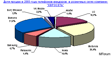 На диаграмме представлены доли продаж розничными сетями компании сотовых телефонов вендоров в 2003 году.