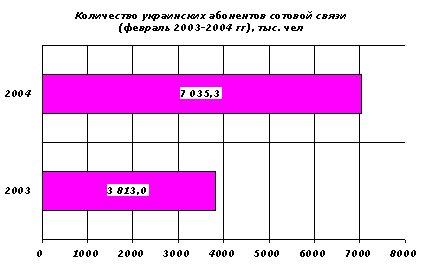 За последние 12 месяцев количество абонентов сотовых сетей в Украине увеличилось на 84,5% и составило 7,035 млн человек (+3,222 млн по сравнению с февралем 2003 года). При этом уровень проникновения увеличился на 6,75 п.п. до 14,76%. По количеству подключений февраль 2004 года в 2,1 раза был лучше февраля 2003 года (197 тысяч против 95 тысяч новых подключений). Как по проникновению, так и по количеству абонентов Украина значительно отстает от России, где эти показатели по итогам февраля 2004 года составили соответственно 27.5% и 39,88 млн абонентов (МФ, 2004-03-04).