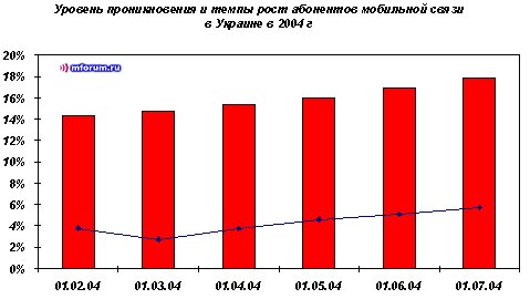 Общий уровень проникновения составляет 17,84%, повысившись практически на 1% пункт по сравнению с концом мая 2004 года. На сегодняшний день Украина по уровню проникновения сотовой связи значительно отстает от России, где этот показатель по итогам июня 2004 года по данным российской исследовательской компании AC&M составил 34% (50 млн абонентов). Следует отметить, что показатель прироста абонентской базы, начиная с февраля 2004 года имеет устойчивую тенденцию к росту: 5,7% в июне против 2,7% в феврале.