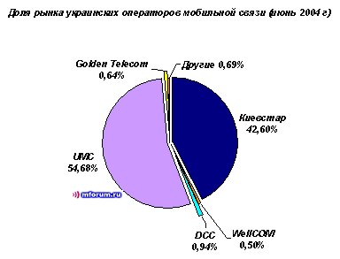 Крупнейшему оператору рынка UMC удалось охватить более 54,68% рынка мобильной связи (+0,35% за месяц). У «Киевстар» - 42,6% (-0,13%), DCC – 0,94% (-0,12%), “Голден Телеком” - 0,64% (-0,03%), WellCOM – 0,5% (-0,03%), другие – 0,69% (-0,04%). Рынок по-прежнему поделен между двумя крупными игроками UMC и "Киевстар", на долю которых приходится порядка 97% рынка. Доля мелких операторов сократилась с 4,22% в конце мая 2003 года до 2,73% в конце июня текущего года.