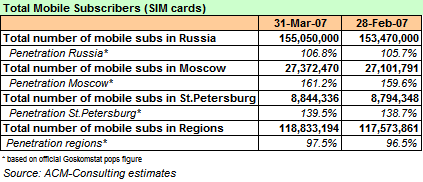 На 31 марта 2007 года проникновение SIM-карт в Москве и С.Петербурге составило, соответственно, 161 и 140 SIM-карт.