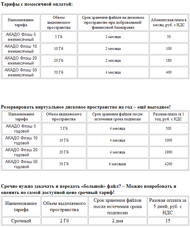 Как известно, абонентам в рамках услуги "АКАДО. Файлы" уже выделено бесплатное виртуальное пространство объемом 300 Мб. "Файлы" подключаются при оплаченной услуге по тарифам, включающим доступ интернет.