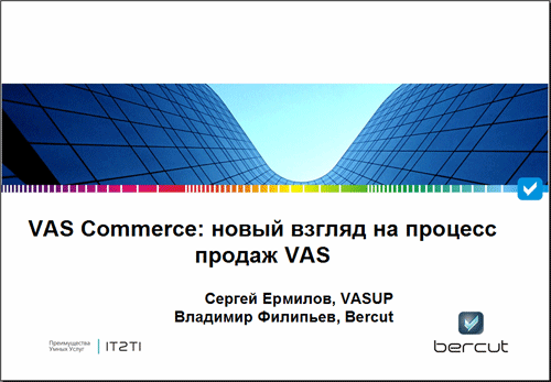 Вчера в Москве начала работу конференция "Россия и СНГ. Ком" (Russia & CIS Com), организованная компанией informa telecoms & media. MForum.ru представляет мультимедийную презентацию, подготовленную на базе совместного доклада Сергея Ермилова, VASUP и Владимира Филипьева, Bercut - "VAS Commerce: новый взгляд на процесс продаж VAS".
