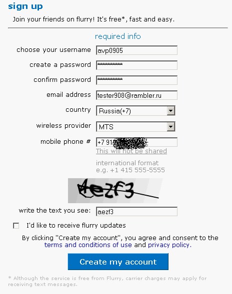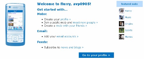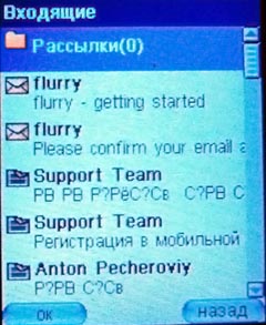 Flurrymail, не является почтовым клиентом в обычном смысле этого слова, он представляет собой сервис по работе с электронной почтой. Кстати, данный сервис стал лауреатом премии Duke's Choice Award от Sun Microsystems. Пользовательский интерфейс – на английском языке. Процесс регистрации в сервисе Flurry (Flurrymail является одной из функций сервиса Flurry), весьма прост и не требует дополнительных пояснений. Регистрацию можно осуществить как с компьютера, так и через встроенный браузер телефона. При регистрации в сервисе Flurry необходимо ввести страну, используемого оператора сотовой связи и номер телефона.