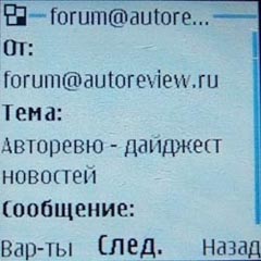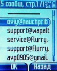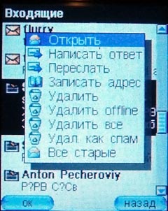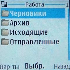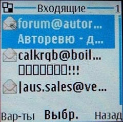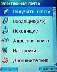 При каждом входе в пункт «Email-сообщения» меню «Сообщения» телефон предложит подключиться к серверу и проверить наличие новых сообщений. По окончании загрузки сообщений (или отрицательном ответе на запрос подключения) будет отображена папка входящих сообщений. Для перехода к функциям работы с сообщениями нажимают клавишу вызова меню. В целом, пользовательский интерфейс работы с электронной почтой очень удобен, доступ ко всем функциям организован вполне логично. Работа с сообщениями написанными кириллицей, также не вызывает проблем.
