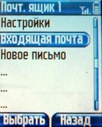 Настраиваемые параметры разделены, по функциональному назначению, на три группы, каждая из которых выделена в отдельный подпункт меню Настройки. В подменю «Почтовый сервер» находятся параметры подключения к серверу – имя пользователя, пароль, адрес электронной почты, имена серверов входящей и исходящей почты. Для входящей почты рассматриваемый e-mail клиент поддерживает только протокол POP3. В подменю «Дополнительно» находятся параметры подключения к серверам входящей и исходящей почты – используемые порты, адрес сервера DNS и настройка режима SMTP-аутентификации. В подменю «Доступ в сеть» собраны параметры подключения к Интернет – тип используемого канала (GSM/GPRS) и его настройки. Для GPRS канала настраивают точку доступа, имя пользователя и пароль. Настройки подключения к Интернет задают в явном виде, использовать готовый профиль нельзя. Также нет возможности указать прокси-сервер. Встроенный e-mail клиент телефона Philips Xenium 9@9i поддерживает только два почтовых ящика.