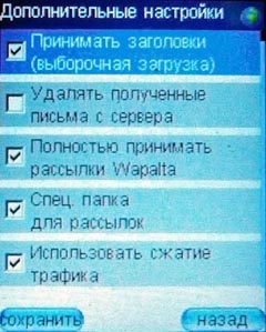 Среди полезных возможностей JAVA-клиента Wapalta, следует отметить функцию автоматической проверки поступления новой почты с подачей звукового сигнала. Причем, что весьма ценно, можно настроить автоматическое отключение данной функции в ночное время – с 22.00 до 8.00. Интервал автоматической проверки поступления новой почты настраивается ступенчато – 1 раз в 5, 15, 30 или 60 минут.