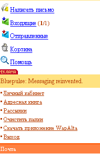 Сервис Wapalta по возможностям работы с электронной почтой аналогичен рассмотренному выше сервису Flurry, его отличительной особенностью является русскоязычный интерфейс и меньшее любопытство к личным данным пользователя – при регистрации достаточно ввести номер телефона. При использовании Wapalta, одновременно можно работать только с одним почтовым ящиком. Также как и с Flurrymail, с Wapalta, можно работать как через web-интерфейс, так и через JAVA-приложение, обладающее русскоязычным интерфейсом. При загрузке приложения через http-браузер телефона, сайт Wapalta, автоматически определит его модель и предложит версию мидлета наиболее подходящую для конкретного телефона.