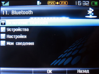 Bluetooth в телефоне полнофункциональный, он даже выделен в отдельный пункт главного меню. Интерфейс крайне прост: включение, список устройств, настройки (режим видимости, удаленный доступ, профиль для гарнитуры) и сведения (имя устройства и Bluetooth-адрес). При взаимодействии с другими устройствами, будь то телефон, гарнитура или ноутбук, проблем у нас никаких не возникало.