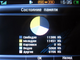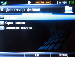 Функции файл-менеджера выполняет меню «Диспетчер файлов», выделенное в отдельный пункт главного меню. В нем отдельные пункты предусмотрены для содержимого памяти телефона, карты microSD и просмотра состояния памяти (также отдельно для телефона и карты; показывается количество свободной памяти, а также объем, занятый той или иной категорией файлов). В общей сложности получается около 40 Мб встроенной памяти. Он расширяется картами microSD, слот для которых находится на правой боковой стороне внизу. Он прикрыт заглушкой из мягкого пластика, крепящейся к корпусу на коротком шлейфе. Ее легко отодвинуть, и манипуляциям с карточкой заглушка нисколько не помешает.