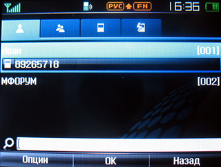 Память телефона рассчитана на 500 ячеек, и еще до 250 может храниться на R-UIM –карте. При вводе нового контакта указывается имя абонента, изображение, до 4 номеров (мобильный, домашний, рабочий, факс), группа («Общий», «Семья», «Офис», «Школа», «Друзья»), мелодия, e-mail и текстовая заметка.