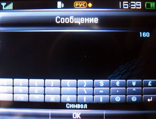 При вводе SMS на экране одновременно отображается до 6 строк текста, но если вы набираете SMS, то его максимальную длину вы исчерпаете уже на второй строке (при вводе на русском языке). На каждой умещается примерно 40 символов. Максимальная длина сообщения на кириллице (если в тексте сообщения есть хотя бы один кириллический символ) – 70, на английском – 160 символов. Опций типа регулировки размера и вида шрифта, или же добавления картинок, звуков и т. д. не имеется. При вводе кнопка «Рус/Eng» отвечает за переключение языка, «SYM» - за символьный режим, а кнопка с вертикальной стрелкой – за переключение буквенного регистра. Стереть неправильно набранный символ можно кнопкой с горизонтальной стрелкой (она же активирует виброрежим).