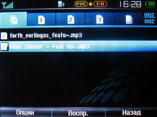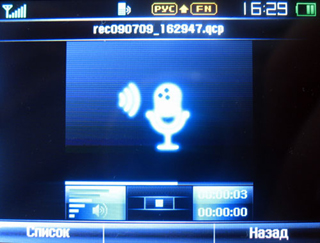 Интерфейс плеера нехитер. Большая часть экрана вообще пустует, только черный фон и ничего более. Вверху отображается имя исполнителя и название композиции (причем не бегущей строкой, а обычной, из-за чего название песни выводится не полностью). Внизу – визуализация в виде прыгающего при воспроизведении эквалайзера, под которым собственно панель управления. Громкость регулируется боковым колесиком по 6 уровням. Запас ее достаточный; если вы в наушниках, то в помещении вам будет вполне достаточно и половинного уровня. Что касается воспроизведения через спикерфон, то оно вполне приемлемое для бизнес-аппарата: хотя басов несколько не хватает, качество звучания неплохое. «Родные» наушники тоже обеспечивают хороший звук; впрочем, наличие стандартного 2,5-мм разъема позволяет вам подключать любые «уши» по вашему усмотрению. Обращайте внимание, чтобы штекер до конца входил в гнездо, иначе потери громкости будут очень большими.