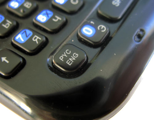 QWERTY-клавиатура представлена 35 кнопками. Ее характерная черта – наличие промежутков между всем кнопками, они отграничены друг от друга. С нашей точки зрения, это более выигрышное решение по сравнению с тем, когда клавиши расположены впритык (как, например, в смартфоне Blackberry 8800): палец ложится большей частью именно на ту кнопку, которая нужна, а не сразу на 3-4 соседних. Клавиши, расположенные рядом, тоже слегка ощущаются пальцем, конечно, но неправильных нажатий не происходит. Отчасти этому способствует рельеф кнопок: поверхность каждой сделана хотя и ровной, но наклонной (скос идет сверху вниз), что прекрасно видно в профиль. Сами кнопки прямоугольной формы. Что особенно приятно, обозначения на них довольно большие и читаются хорошо, причем как латинские и кириллические, так и символы. Пробел большой, нажимается удобно. Вообще нажатия всех клавиш четкие, с ощущающимся ходом. Отметим как плюс и то обстоятельство, что даже при длительносм наборе текста пальцы не устают.