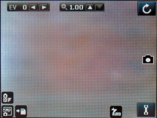 Интерфейс камеры вызывает ассоциации с Sony Ericsson: используется похожая система меню съемки. Ориентация интерфейса горизонтальная, видоискатель занимает весь экран. По бокам находятся статусные иконки, показывающие текущие параметры съемки. Нажатие навигационной кнопки вверх-вниз регулирует цифровое увеличение (до 8х), влево-вправо – яркость (плюс-минус 4 пункта). Нижняя софт-кнопка – вызов меню настроек камеры, верхняя – выход в режим ожидания. Меню представляет собой горизонтальную строку с иконками, выбранный пункт раскрывается в вертикальный список параметров. Режимы съемки: обычный, оптимальная съемка (параметры, включая макрорежим, определяются автоматически), мультисъемка (съемка продолжается, пока нажата кнопка спуска), серийная съемка (три кадра за одно нажатие кнопки спуска, максимальное разрешение – 3 Мп), рамка. Сюжетные программы: авто, портрет, пейзаж, ночь, спорт, документы, съемка со стабилизатором. Разрешение меняется от 240х320 до 2576х1932. Режимы работы вспышки: автоматическая, выключена, принудительно включена, подавление красных глаз. Режимы фокусировки: авто, макро, бесконечность.