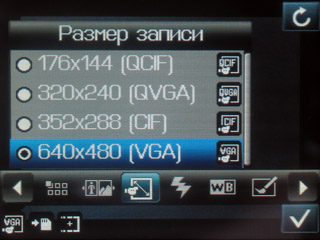 Интерфейс при видеосъемке аналогичен, отличается только набор параметров. Разрешение меняется от 176х144 до 640х480, можно использовать подсветку, менять баланс белого и эффекты. Длительность съемки – не ограничена, 15, 30 или 60 секунд. Режим автофокуса – выключен, разовый, постоянный.