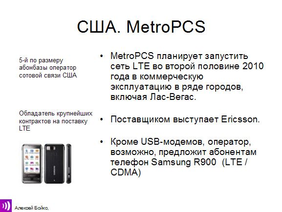 Компания располагает 20 МГц в диапазоне AWS и 12 МГц в диапазоне 700 МГц. Частоты в диапазоне 12 обеспечивают возможность обеспечить покрытием 300 млн населения.MetroPCS, основные рынки США, поставщик - Ericsson, план запуска - конец 2010 в ряде городов
