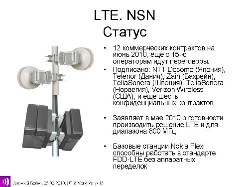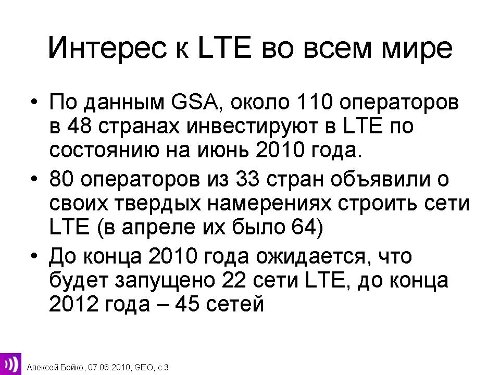 "Если бы кто-то поприсутствовал на заседаниях второго международного бизнес-форума «Эволюция сетей мобильной связи – LTE Russia & CIS 2010», который завершился вчера, 26 мая 2010 года, в Москве, то ему сразу стало бы видно, что участники или, по крайней мере, докладчики полны оптимизма. Они увлеченно демонстрировали цифры роста скоростных и беспроводных сетей, указывали на развитую экосистему действующих HSPA и будущих LTE-сетей, обращали внимание слушателей на мысли руководителей операторов связи, в которых сквозит четкое решение развивать мобильную «широкополоску». Однако оставим в стороне ярко-оптимистичные слайды с завлекательными названиями типа New challenges for operators или Best mobile broadband, а также Mobile internet transformation и постараемся рассмотреть ситуацию в практическом плане".