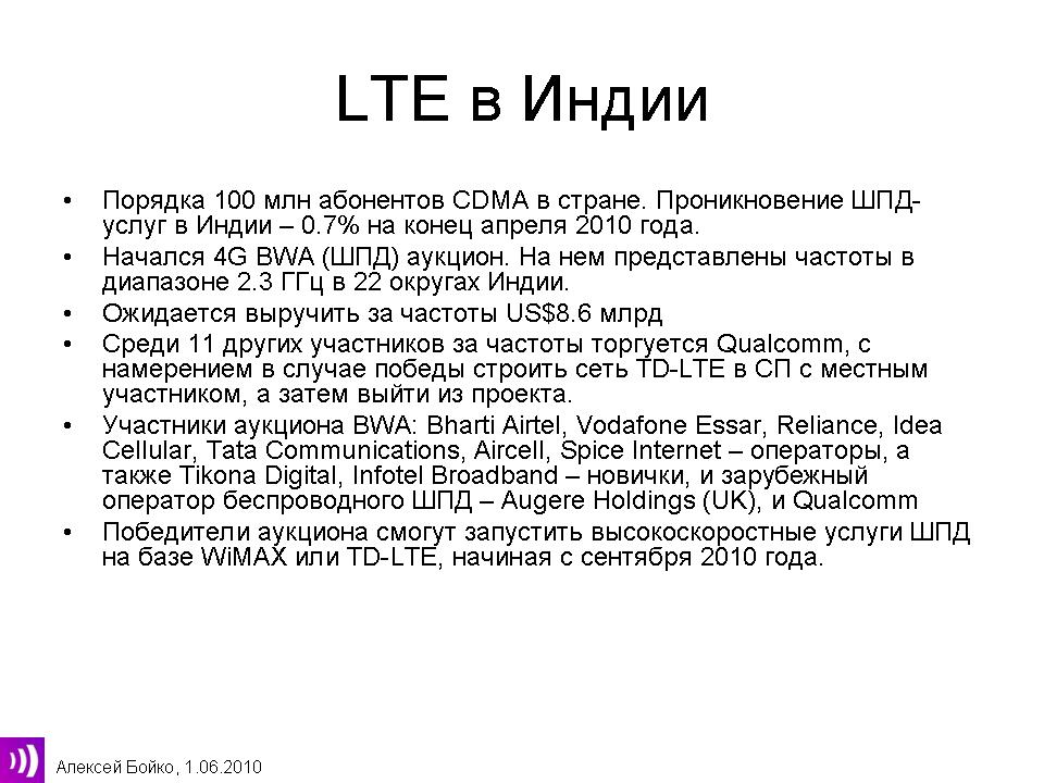 Есть вероятность появления на рынке Индии совместного проекта LTE одного из операторов Индии и компании Qualcomm. 04.2010