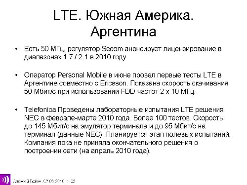 05.2010 В теории в Аргентине под LTE может быть выделено 50 МГц спектра. Secom анонсирует лицензирование частот в диапазонах 1.7 / 2.1 ГГц в 2010 году? >>>>