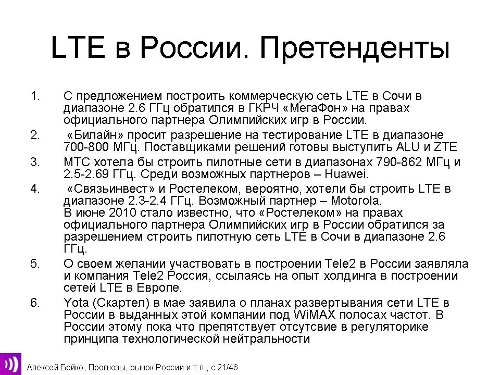 Таким образом, картинка основных претендентов на развертывание LTE на российском рынке выглядит так: