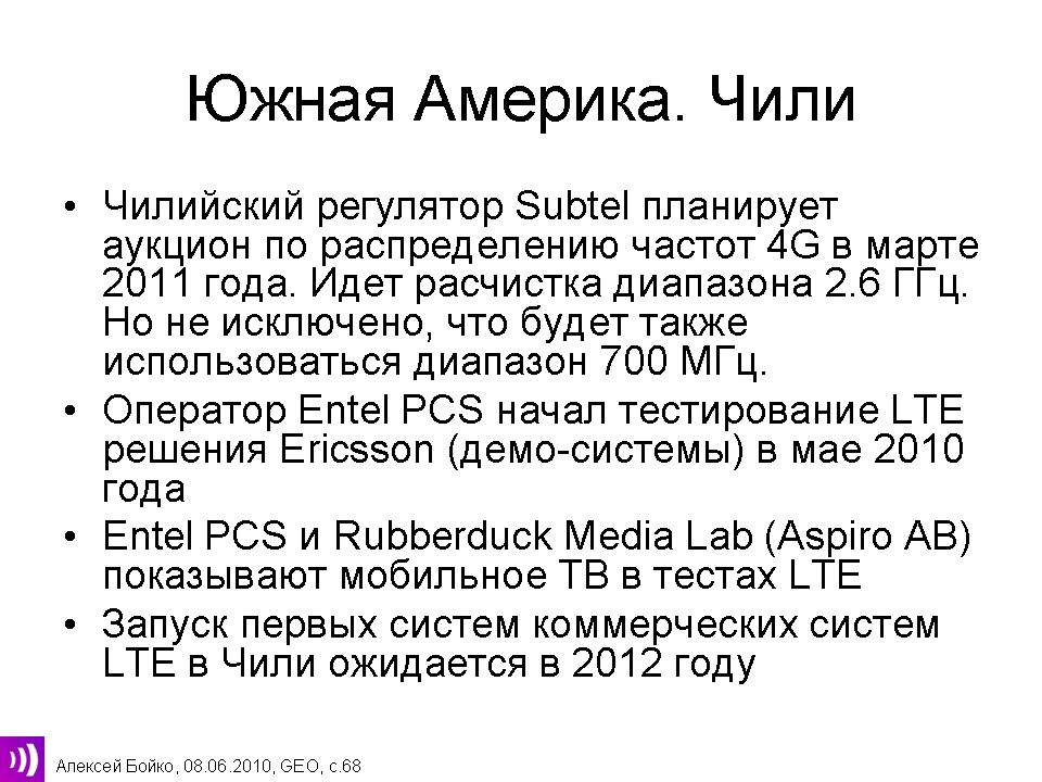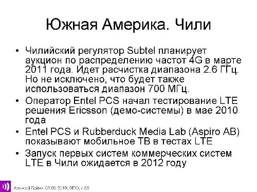 Колумбия - есть полоса 60 МГц под LTE. Существующие операторы не смогут принять участие в аукционе по распределению полосы в 60 МГц в диапазоне 2.5 ГГц, который намечен на середину 2010 года >>>>