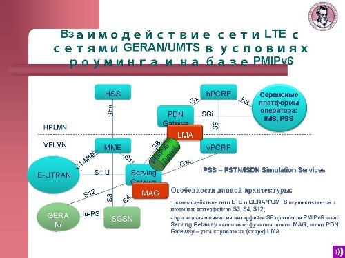 Взаимодействие сетей LTE с сетями 3GPP в условиях роуминга на протоколе прокси MIPv6. Здесь создается специальный тоннель между сервисным и пакетным узлами домашней сети. В этой ситуации сервисный узел выполняет функции шлюза MAG, а пакетный (PDN) - функцию узла привязки LMA.