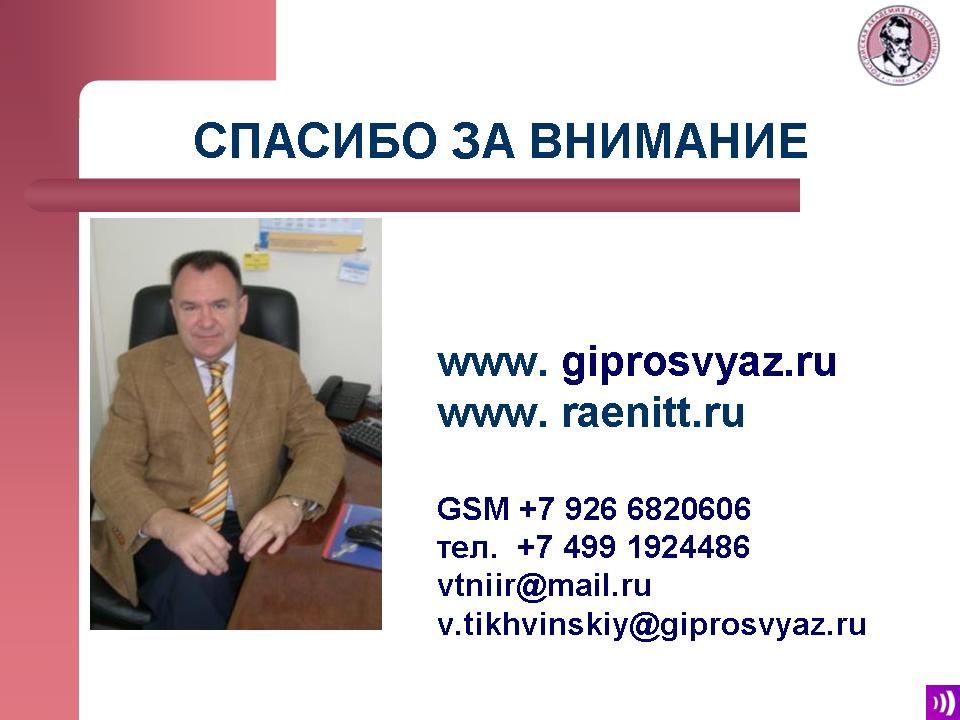 Я представляю известный институт ОАО "Гипросвязь", который в настоящее время получил новую функцию - он является Центром компетенции ОАО "Связьинвест". Соответственно, в качестве центра компетенции, мы сейчас выступаем в качестве генерального подрядчика при создании сети LTE в диапазоне 2.3 - 2.4 ГГц для компании "Ростелеком". Вы итоги конкурса все помните, 39 регионов было разыграно на этом конкурсе и будет создаваться сеть TDD-LTE. Поэтому мы накапливаем компетенции в области LTE.