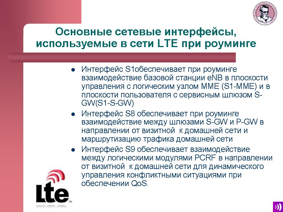 Основные сетевые протоколы. S1 обеспечивает взаимодействие базы LTE в плоскости управления с логическим узлом MME (S1-MME), а в области пользователя - с сервисным шлюзом S-GW (S1-U). Интерфейс S8 обеспечивает взаимодействие между шлюзами: сервисным S-GW и пакетным P-GW в направлении от визитной сети к домашней. Также осуществляется маршрутеризация трафика в домашней сети. Интерфейс S9 обеспечивает взаимодействие между двумя логическими модулями, которые определяют политики и тарификацию в направлении от визитной к домашней сети.