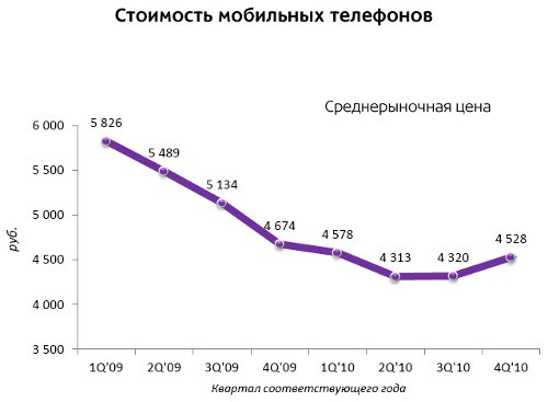 По итогам 4 квартала 2010 года, рынок мобильных телефонов в денежном выражении составит 47 млрд. рублей, что на 15 % больше аналогичного периода 2009 года. Рост по отношению к 3-му кварталу 2010 года составит 11%.