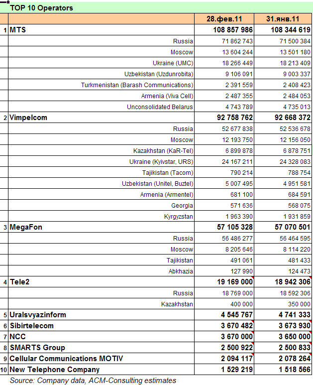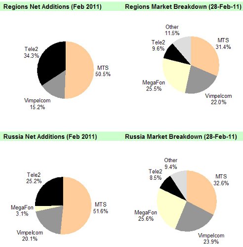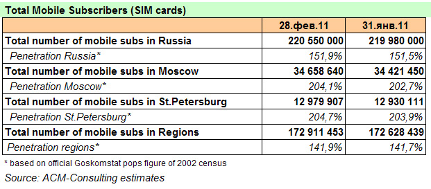 Прирост числа абонентов в феврале 2011 года составил 0.6 млн.