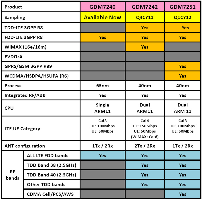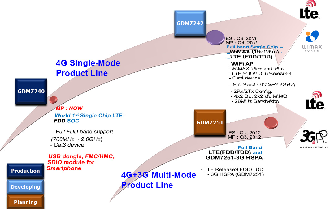 Планы выпуска чипов – переход на 40 нм, добавление поддержки WiMAX (GDM7242) или 3G/2G (GDM7251).