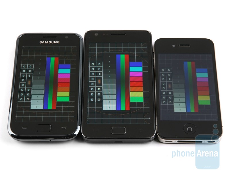 Контрастность Super AMOLED экранов оказалась выше, но дисплей IPS-LCD, встроенный в iPhone 4, был ярче – очевидно, часть яркости на дисплеях Samsung компенсируется антиотражательным покрытием.