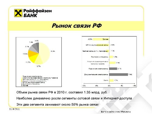 Слайд показывает объем телекоммуникационного рынка России по данным Росстата. Видно, что в 2010 году рынок вырос менее, чем на 2%, при этом наиболее динамичными оказались сектор сотовой связи и сектор интернет-доступа. Эти два сектора занимают более половины всего рынка – 44% сотовая связь, 11% - ШПД. С учетом того, что эти два сегмента являются основными, как по объему, так и по динамике, им и будет уделено основное внимание.