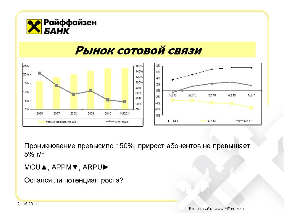 Проникновение сотовой связи в РФ сейчас превышает 150%. Это один из самых высоких показателей в мире. При этом темпы роста абонентский базы за 4 месяца 2011 года снизились и составляют сейчас менее 4%. Тезис о том, что рост абонентской базы больше не будет основным драйвером роста телеком-компаний – уже не требует доказательств в силу очевидной справедливости.