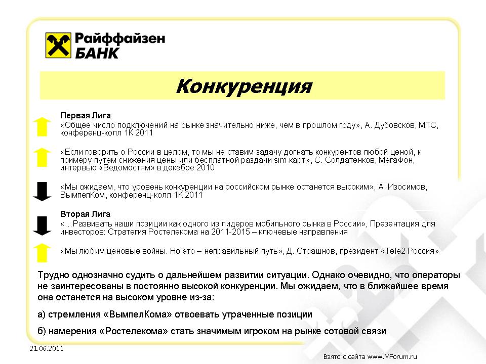 На слайде приведено несколько заявлений топ-менеджеров коммуникационных компаний – «большой тройки», «Ростелекома», Tele2. Их заявления посвящены конкуренции и они разнонаправлены. То есть единых мнений нет в этом плане. В частности, МТС, «МегаФон» и Tele2 говорят, что они будут стремиться к снижению конкуренции. «Ростелеком» и «Вымпелком» говорят о том, что конкуренция сильна и они в ней заинтересованы. Причины понятны. «Вымпелком» хотел бы отыграть позиции на российском рынке, которые уступил «МегаФону» в 2010 году. «Ростелеком» хотел бы стать значимым игроком на телеком рынке России в сегменте сотовой связи, пусть и не в голосовом. Но и для того, чтобы стать значимым игроком в сегменте беспроводного ШПД, требуются значительные инвестиции. Думаю, что «Вымпелком» и «Ростелеком», по крайней мере, в ближайшее время, будут оказывать влияние на конкурентную ситуацию, что сохранит конкуренцию на достаточно высоком уровне. В долгосрочной переспективе ни один из крупных операторов не заинтересован в постоянно высоком уровне конкуренции, так что, возможно, при достижении каких-то ориентиров, можно будет видеть снижение конкуренции.
