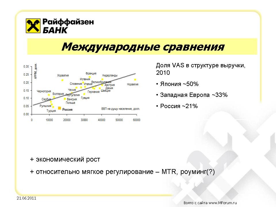 Международным инвесторам, выбирающим между инвестициами в РФ и в другие страны, следует учитывать, что в РФ ожидается экономический рост выше, чем в Европе (около 5% в 2011-2012 годах), тогда как в странах Центральной, Восточной и Южной Европы – от 2% до 4%, в Западной Европе – 2%. В части регулирования в России условия пока что заметно мягче европейских, во-первых, не регулируется интерконнект. В прошлом году проводились круглые столы, посвященные регулированию вообще и MTR, в частности. Я так понимаю, что «за» регулирование высказался только «Скай Линк», остальные операторы явно против. Да и регуляторы не особенно видят необходимость в регулировании – отрасль и так конкурентная, излишнее регулирование может привести к ухудшению качества связи и сокращению количества дополнительных услуг, которые предлагают сотовые операторы.