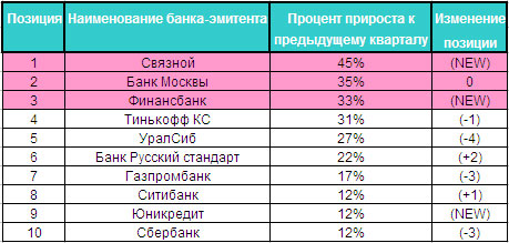 «Во втором квартале 2011 года мы отмечаем существенные изменения в распределении позиций. В частности, сразу три банка впервые появились в рейтинге – «Связной», «Финансбанк» и «Юникредит». В частности, «Связной» стартовал сразу на первом месте. Это, безусловно, объясняется его активной политикой по привлечению новых клиентов, - комментирует Наталья Сергиенко, директор по маркетингу компании ChronoPay. – Не обошлось и без «потерь». В первую десятку не вошли ВТБ24, Росбанк, Альфабанк, уступив место «новичкам».
