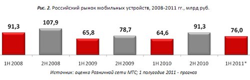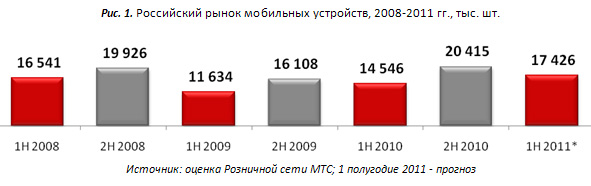 Рынок мобильных телефонов в России в 1 полугодии 2011 года (оценка МТС). Количество проданных в России телефонов в 1 полугодии 2011 года, по предварительной оценке, выросло на 20% в сравнении с аналогичным периодом прошлого года. Реализовано порядка 17,4 млн. аппаратов.