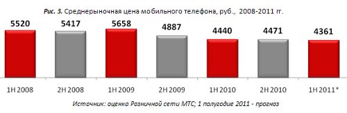 Средняя рыночная цена мобильных телефонов в 1 полугодии 2011 года снизилась на 2% относительно аналогичного периода 2010 года, в первую очередь, за счет снижения себестоимости телефонов.