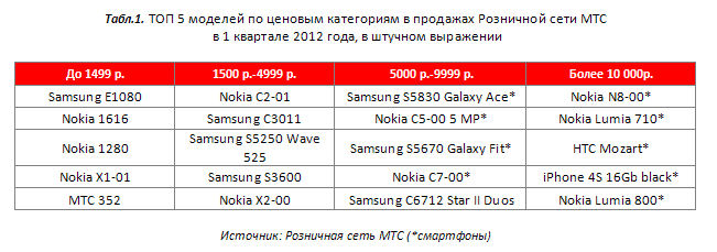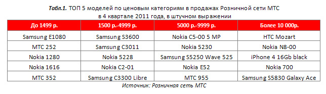 В топ-5 самых продаваемых брендов в Розничной сети МТС вошли Nokia, Samsung, HTC, Sony Ericsson и Apple (iPhone 4s).