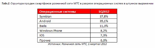 В структуре продаж смартфонов по операционным системам лидирующие позиции занимают Symbian, Android, Bada.