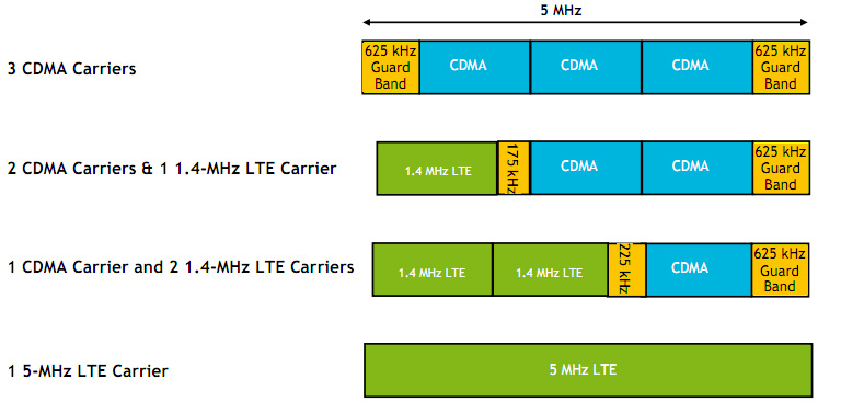 На картинке показаны варианты сосуществования сетей CDMA и LTE компании в пределах полосы 5 МГц.